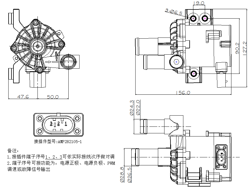 | 額定電壓 | 使用電壓范圍 | 額定電流 | 最大揚程 | 最大流量 | 額定功率 | 最大噪音 |